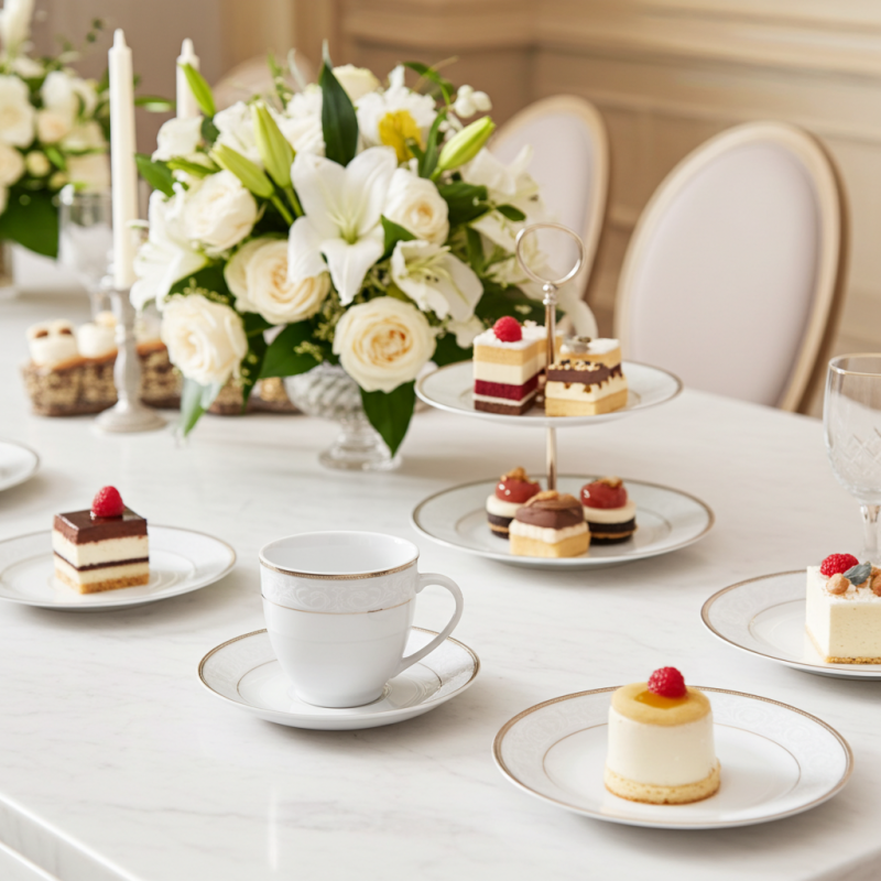 Елегантен Дизайн: Всяка чаша и чинийка е изработена с внимание към детайла, като златните и сребърните акценти придават изтънчен и модерен вид. Изящните орнаменти подчертават красотата на порцелана, създавайки усещане за лукс и класа.