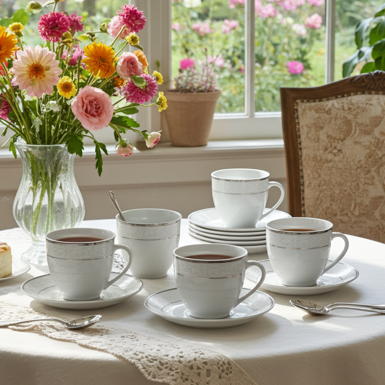 Сервиз за кафе или чай от порцелан с нежен флорален принт и сребърен кант от 12 части за 6 човека.