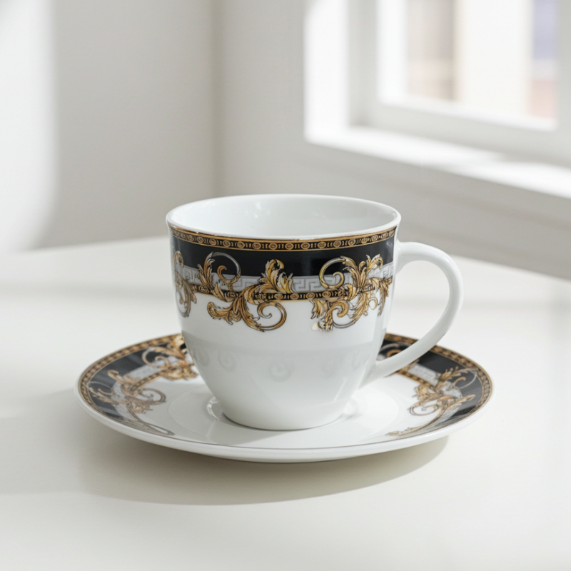 Искате ли да добавите нотка елегантност и лукс към ежедневните си моменти на кафе или чай? Представяме ви нашия изискан комплект от 6 чаши и 6 чинийки в зашеметяваща комбинация от черно и златно – Black & Gold. Този комплект е перфектният избор да превърнете всяка напитка в специално преживяване.