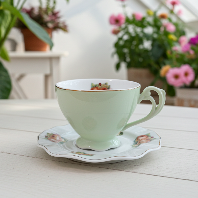 Всяка чаша и чинийка са изработени с внимание към детайла, от висококачествен порцелан, гарантиращ дълготрайност и изискан вид. Нежният зелен цвят на комплекта е допълнен от фин златен кант, който придава нотка на лукс и блясък. Декорацията с флорални мотиви, разположени както вътре в чашата, така и върху чинийката, добавя романтичен и очарователен акцент.