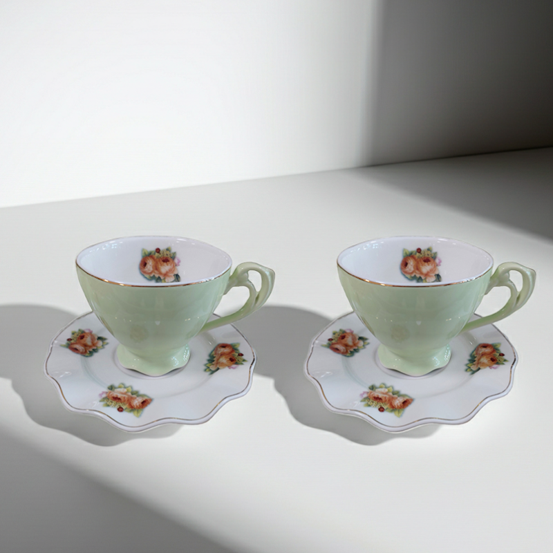 Комплектът "Green Magic" се отличава с нежен зелен цвят и деликатни флорални мотиви, които придават свеж и стилен вид. Златният кант по краищата на чашите и чинийките добавя допълнителна изтънченост и лукс.