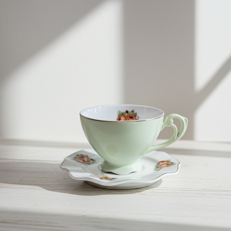 - Цвят: Нежен зелен с флорални мотиви и златен кант