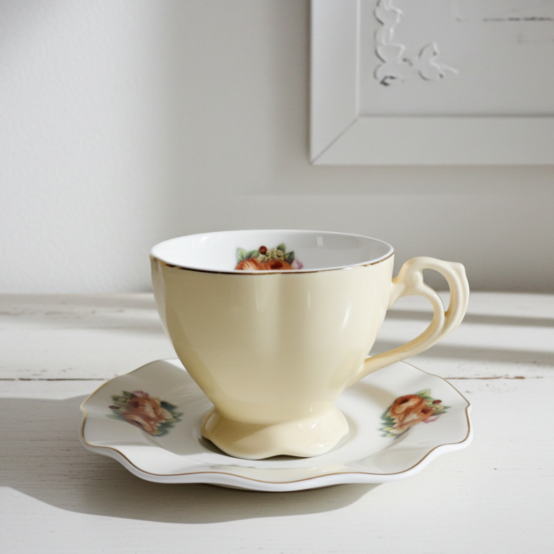 Дизайн и естетика: Всяка чаша е изработена с внимание към детайла, в мек жълт цвят, който напомня за топлите слънчеви лъчи. Деликатните флорални мотиви и финият златен кант добавят нотка изисканост, превръщайки всяка напитка в специален ритуал. Чинийките допълват визията с идентичен дизайн, осигурявайки перфектната основа за вашата чаша.