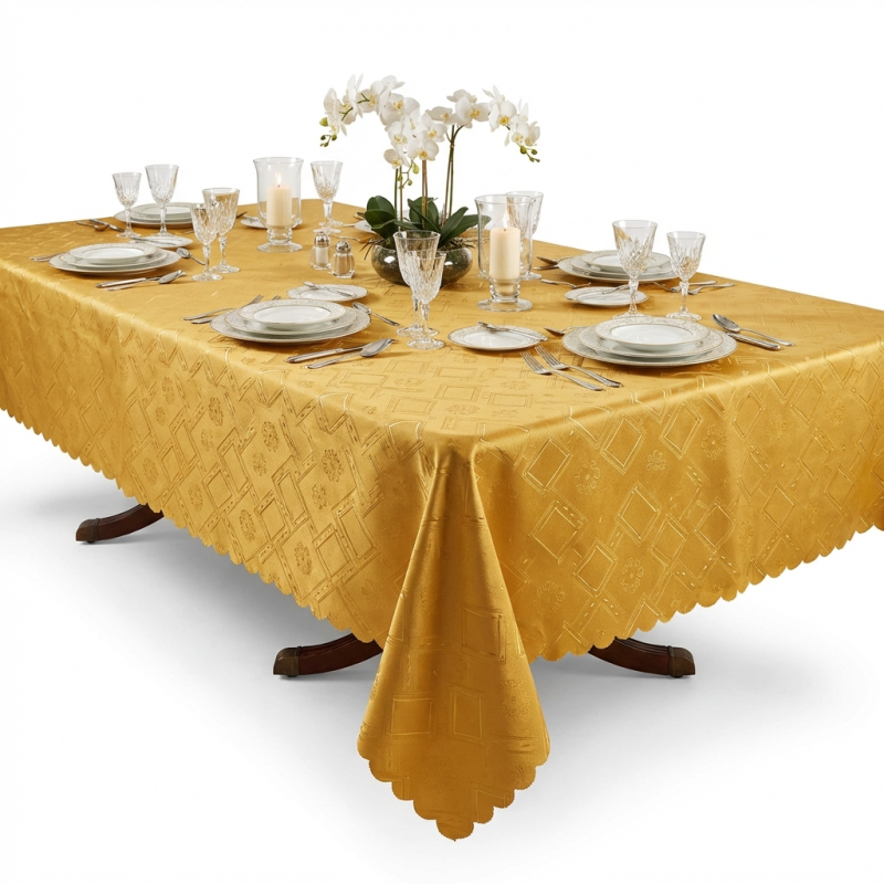 Придайте на трапезарията си неподправен аристократичен дух с луксозната жакардова покривка от серията на Morello. Съчетавайки класически дизайн с модерен финиш, този модел в цвят „златист кехлибар“ е идеалният акцент за празнични вечери или за внасяне на уют в ежедневния интериор.