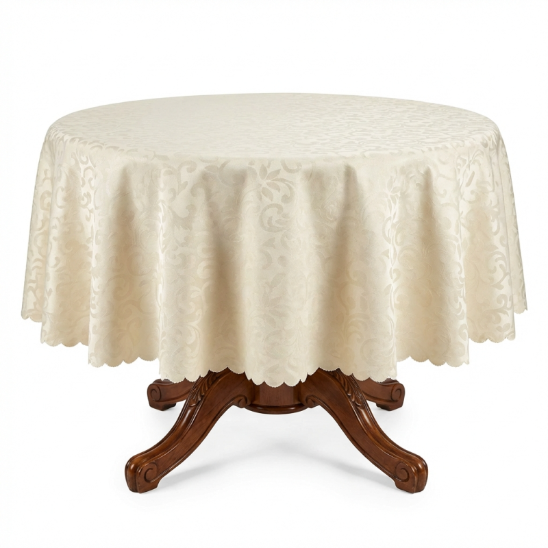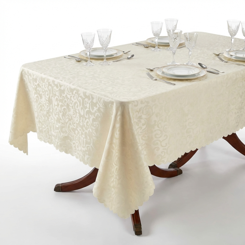 Тази изискана покривка за маса в цвят екрю е перфектното съчетание между класическа естетика и съвременна функционалност. Създадена да преобрази всяко хранене в специално събитие, тя се отличава с деликатни жакардови мотиви, които придават дълбочина и дискретен блясък на материята. Изтънченият растителен дизайн и нежният вълнообразен кант (festoon edge) добавят финалния щрих на лукса, който заслужава вашият дом.