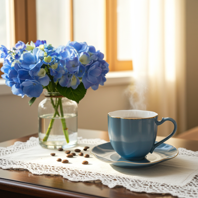 Елегантен комплект за сервиране на топли напитки от висококачествен порцелан в син цвят.
