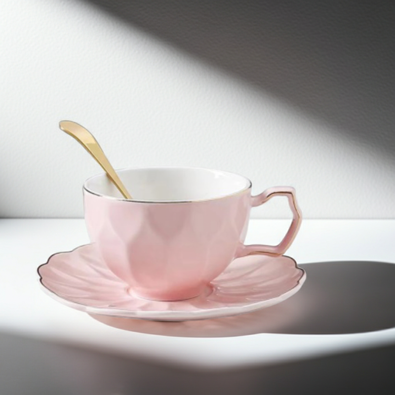 - 1 бр. релефна чаша за капучино или чай 200 мл в елегантен розов цвят със златен кант, начупена дръжка с 2 златни линии
