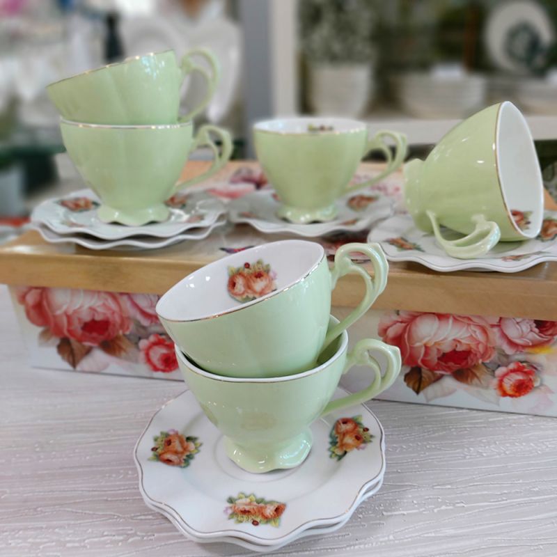 Комплектът е изработен от качествен порцелан в зелен цвят, малки букетчета рози, златен рим и вълнообразна форма на чинийката от 12 части за 6 човека: