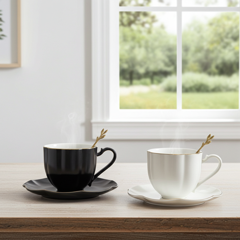 Комплектът е изработен от качествен порцелан в бял и черен цвят с вълнообразна форма на чашата и чинийката:
