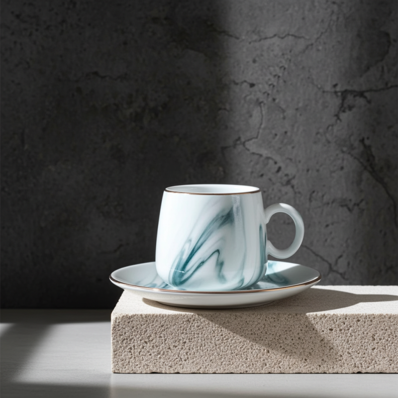 Добавете стил и изтънченост към вашето кафе преживяване с нашия комплект чаши за кафе Blue Marble. Поръчайте сега и се насладете на всяка глътка кафе в елегантна обстановка!