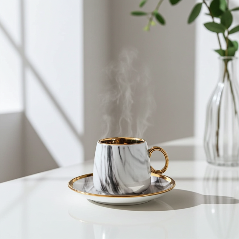 Дизайн и Материали: Комплектът се отличава с красив мраморен десен в сиви и златни тонове, който придава луксозен вид на всяка чаша и чинийка. Златният акцент по ръба на чашите и чинийките добавя допълнителна изтънченост и блясък. Изработени от висококачествена керамика, тези чаши са устойчиви на топлина и запазват аромата на вашето кафе.