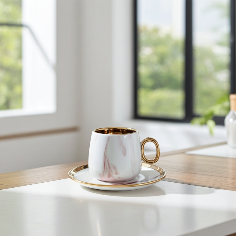 С комплекта "Pink & Gold Marble" вие не просто купувате чаши за кафе, а инвестирате в естетика, уют и незабравими моменти. Превърнете всяка глътка кафе в специално събитие с тези зашеметяващи порцеланови чаши.