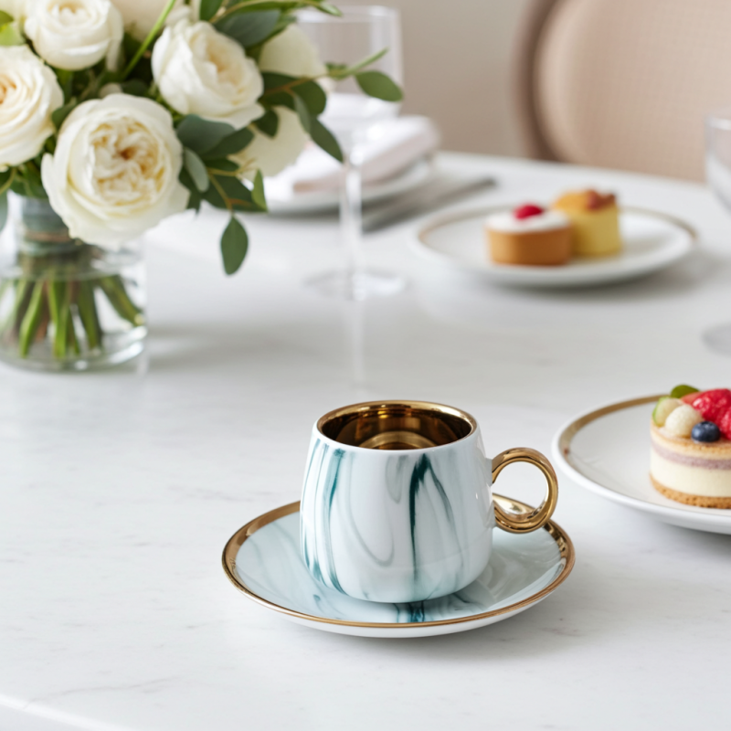 Мраморният ефект в синьо и златно придава на чашите и чинийките изтънчен и модерен вид. Златните акценти подчертават красотата на мраморния дизайн и добавят нотка блясък.