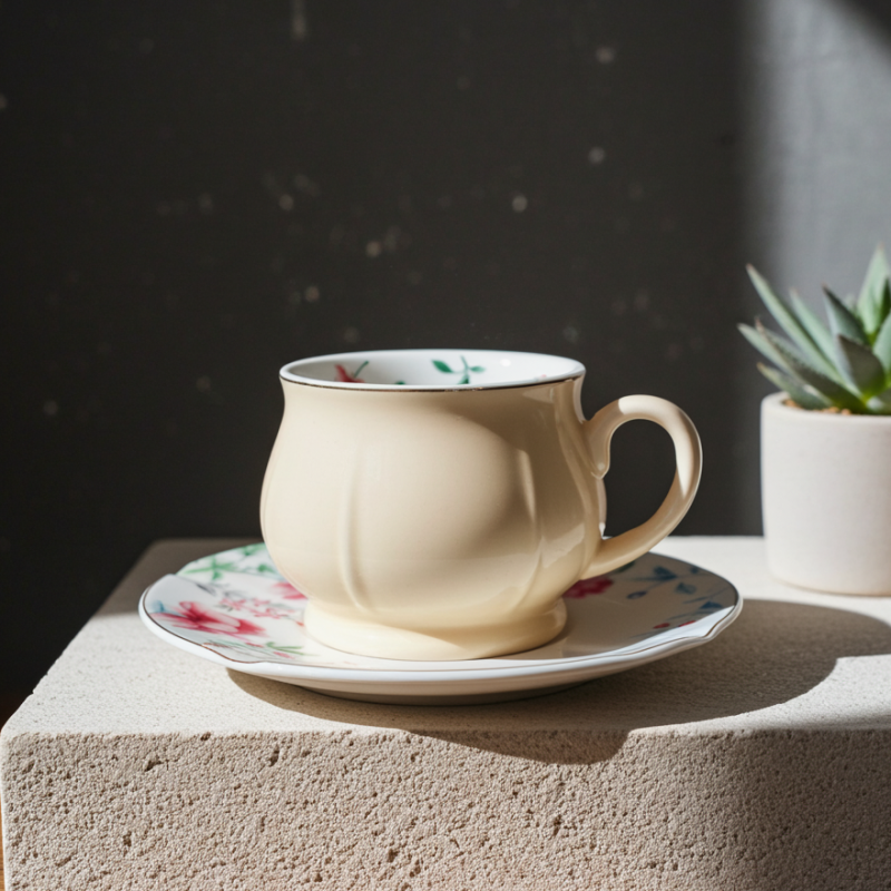 Всяка чаша и чинийка е изработена от висококачествен порцелан, който гарантира дълготрайност и устойчивост. Елегантният жълт цвят на чашите се комбинира перфектно с нежните флорални мотиви на чинийките, създавайки хармоничен и привлекателен вид. Деликатният златист кант придава допълнителен блясък и изтънченост.
