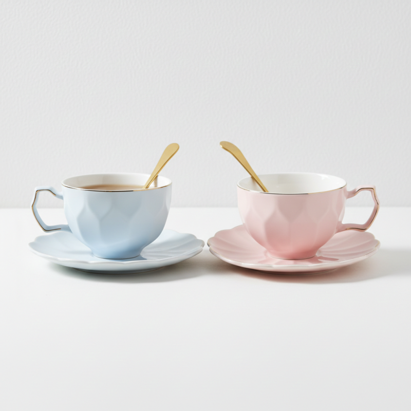 - 2 бр. релефни чаши за капучино или чай 200 мл в нежен цвят със златен кант, начупена дръжка с 2 златни линии