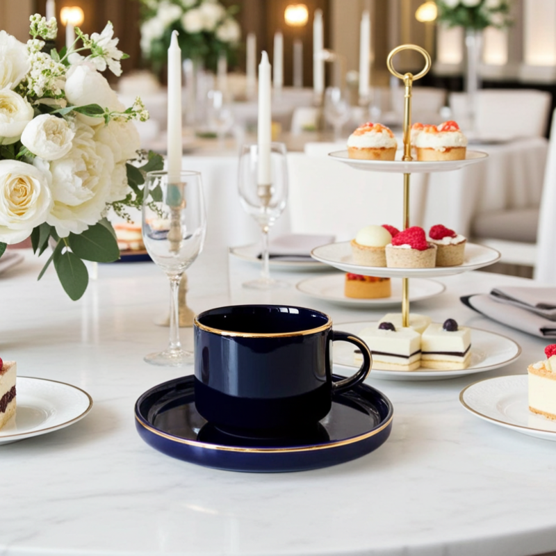 Комплектът Modern Blue се отличава със своя модерен и стилен дизайн, който ще придаде изтънченост на всяка маса. Наситеният син цвят, умело комбиниран с деликатни златни акценти, създава усещане за лукс и елегантност. Изработен от висококачествен порцелан, комплектът е не само красив, но и здрав, устойчив на износване и лесен за почистване.