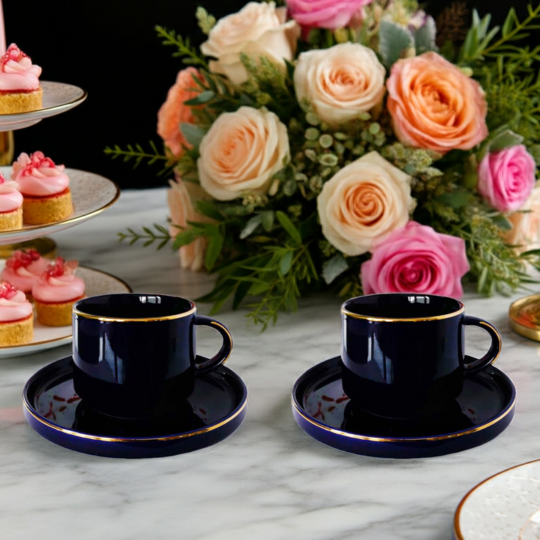 - 2 бр. чаши 200 мл с 2 мм златен кант и две златни линии на дръжкатадиаметър 8,3 см, височина 6,5 см