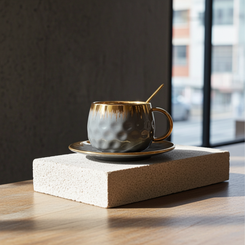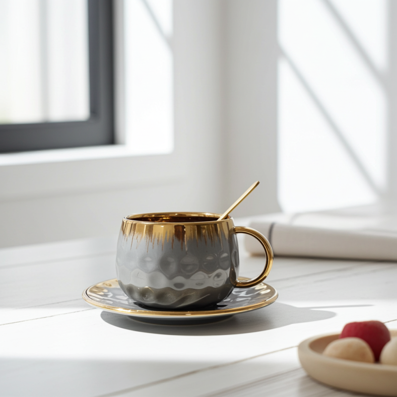 - 1 бр. релефна чаша за капучино или чай 250 мл в преливащо злато и сив цвят