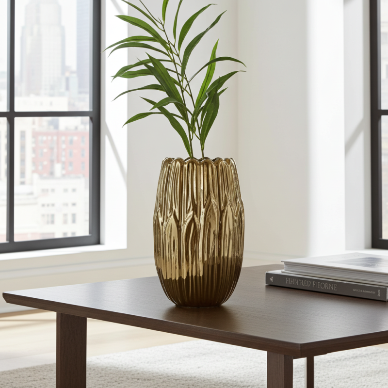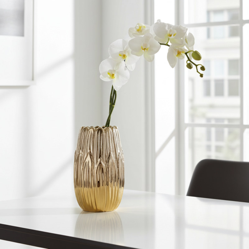 Вазата Gold се отличава с уникален дизайн, който привлича погледа. Нейната златиста повърхност е обработена с прецизност, за да създаде ефект на светлина и сянка, което придава дълбочина и изтънченост. Формата на вазата е модерна и елегантна, позволявайки ѝ да се впише перфектно във всеки интериор – от класически до съвременен.