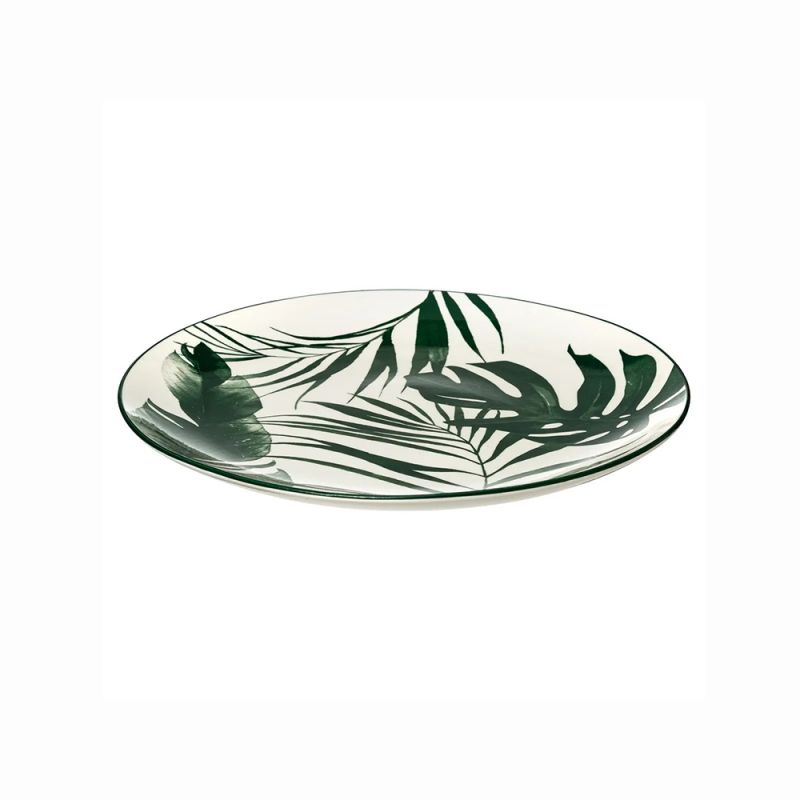 Представяме ви порцеланова чиния с декор тропически листа. Тази чиния е перфектният начин да направите всяко ястие специално. Независимо дали сте домакин на официална вечеря или просто се наслаждавате на семейна вечеря, тази чиния със сигурност ще впечатли вашите гости.