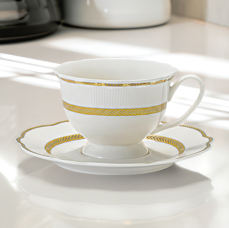 Изискан дизайн: Всяка чаша и чинийка са внимателно декорирани с фини златни акценти, които придават луксозен вид и подчертават елегантната форма на чашите. Златните детайли се съчетават перфектно с бялата порцеланова основа, създавайки хармоничен и стилен вид.