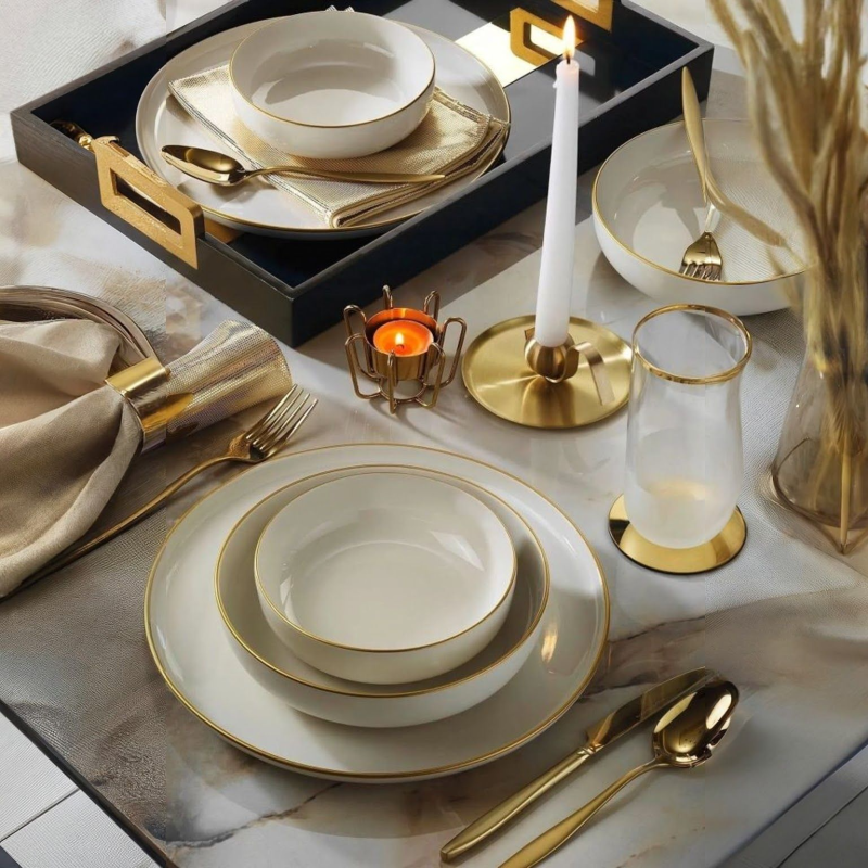 Модерна изработка от качествен порцелан със златен кант, гланц покритие, универсален бял цвят, НЕ е подходящ за микровълнова и съдомиялна.