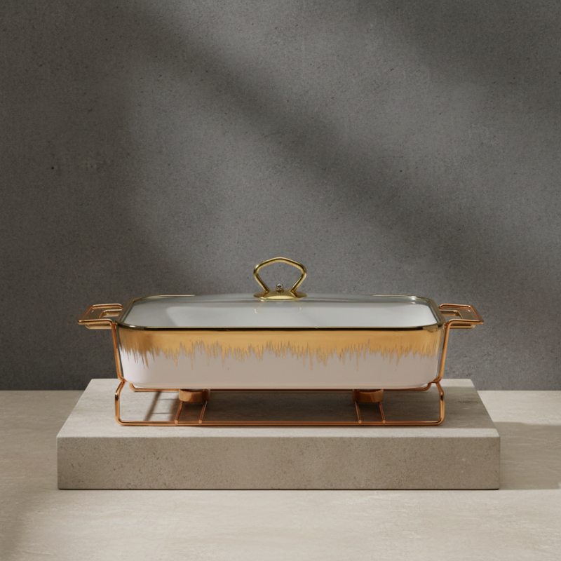 Съдът се предлага в размер - 31 см, което го прави подходящи за различни видове ястия и количества. Включената стойка позволява да сервирате храната директно на масата, като същевременно я поддържате топла и апетитна. Стъкленият капак запазва топлината и аромата, а златните дръжки осигуряват удобство и безопасност при пренасяне.