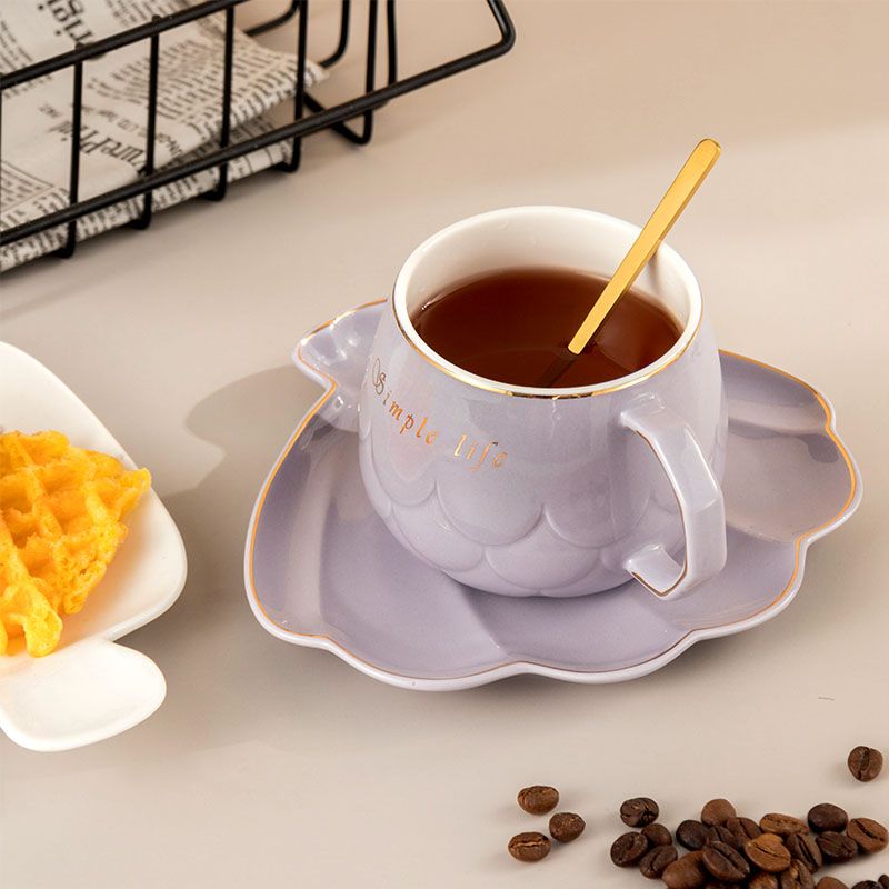 Чинийката, която идва в комплекта, е със специален дизайн във формата на мида, което я прави не само функционална, но и красива декорация. Тя е идеална за поставяне на чашата, както и за малки сладки или бисквитки.