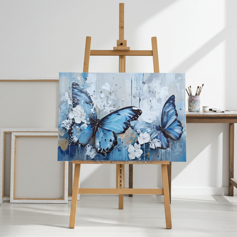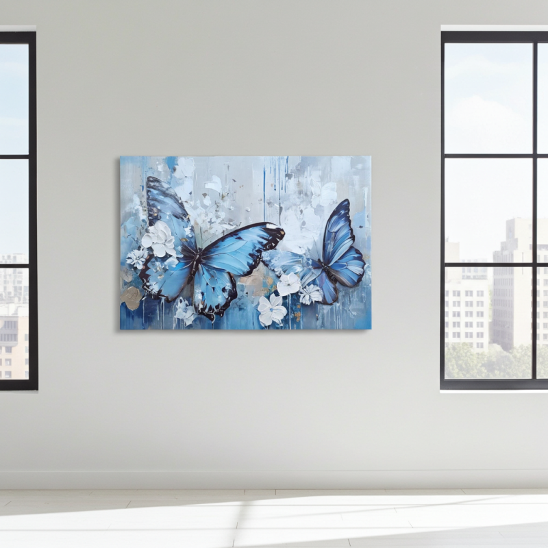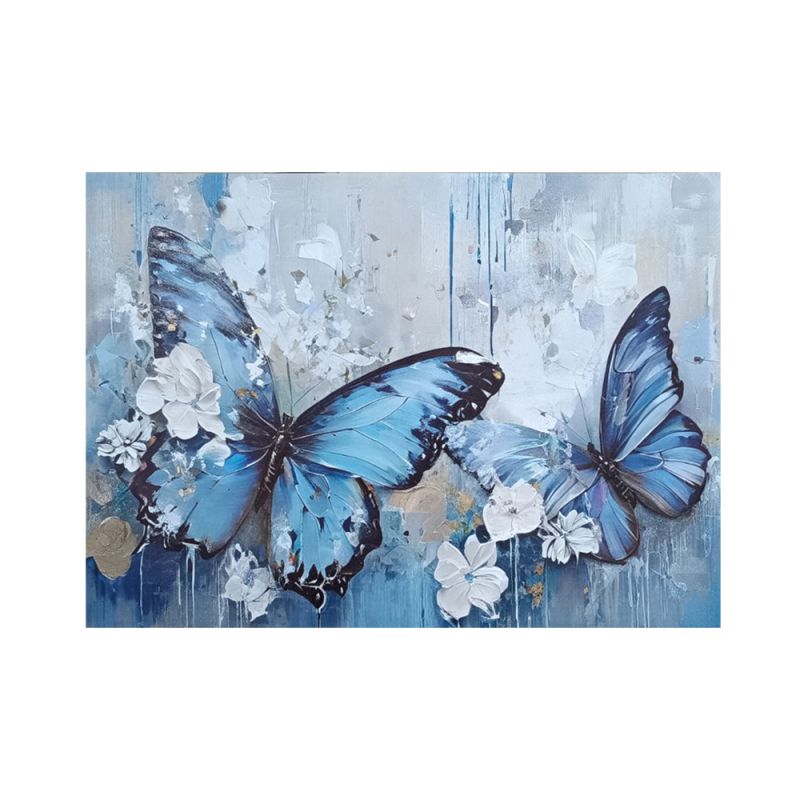 Картината изобразява две красиви пеперуди, заобиколени от нежни цветя. Меките сини нюанси и деликатните бели акценти създават успокояваща и релаксираща атмосфера. Висококачествената канава осигурява дълготрайност и устойчивост на цветовете, което гарантира, че ще се наслаждавате на тази картина години напред.
