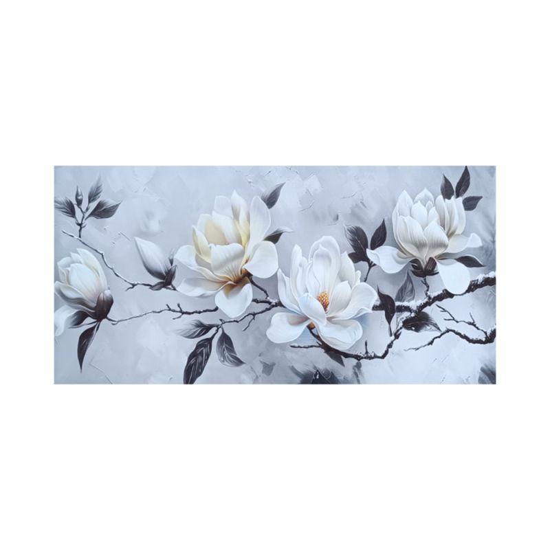 - Изискан дизайн: Картината изобразява нежни цветове на магнолии, внимателно разположени върху канава, създавайки усещане за дълбочина и реализъм.