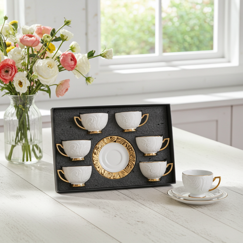 Универсалност и Практичност: Този комплект не е само красив, но и практичен. Подходящ е както за ежедневна употреба, така и за специални поводи. Може да се използва за сервиране на кафе, чай или други топли напитки. Лесен е за почистване и поддръжка, което го прави идеален избор за всяко домакинство.
