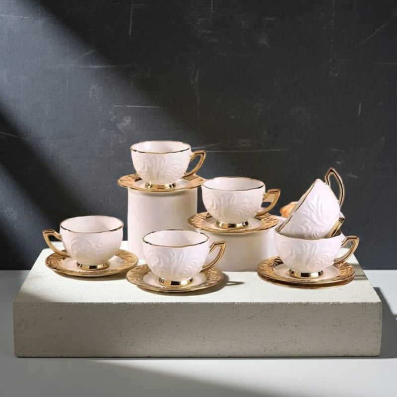 Дизайн и Материал: Комплектът е изработен от висококачествен порцелан, който е известен със своята здравина и елегантен външен вид. Всяка чаша и чинийка е украсена с фини златни детайли, които придават изтънченост и лукс. Релефните мотиви добавят допълнителен визуален интерес и текстура.