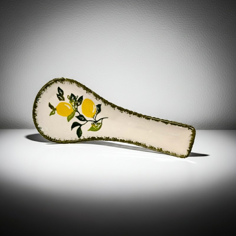 Изящна керамична лъжица с декор лимони и зелен ретро кант, които пресъздават визуално изживяване при всяко използване.