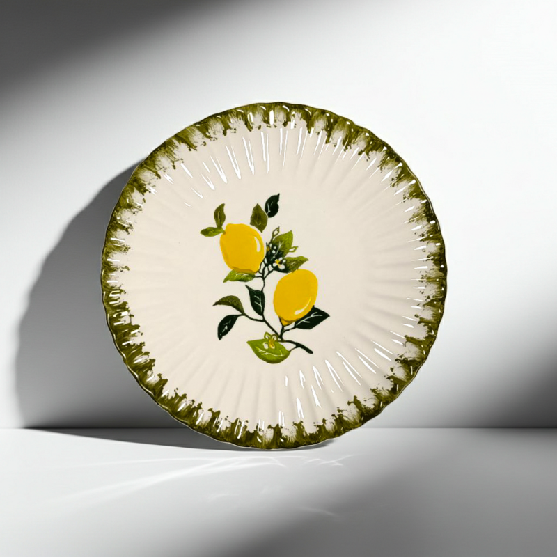 Изящна керамична чиния с къдрава форма, декор с лимони и зелен ретро кант, които пресъздават визуално изживяване при всяко използване.