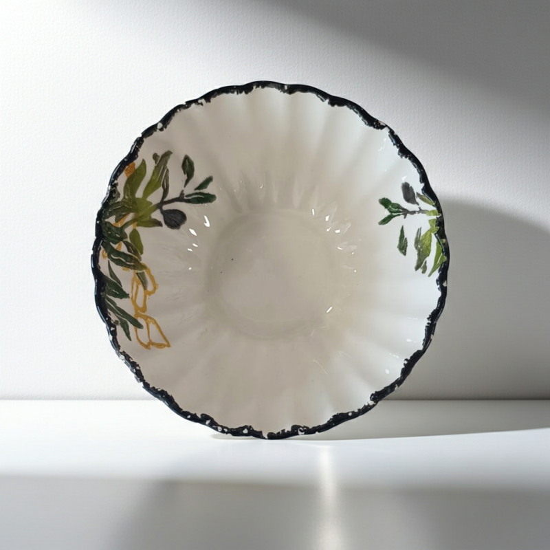 Изящна къдрава керамична купа с декор маслини и ретро черен кант.