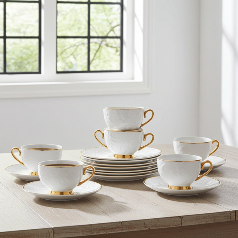 Търсите перфектния комплект чаши за кафе, който да добави елегантност и стил към вашата сутрешна рутина или специални поводи? Представяме ви нашия изискан комплект за кафе White & Gold, който включва 6 чаши и 6 чинийки, изработени от висококачествен порцелан. Този комплект е идеалният избор за ценителите на кафето и красивите вещи.