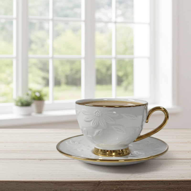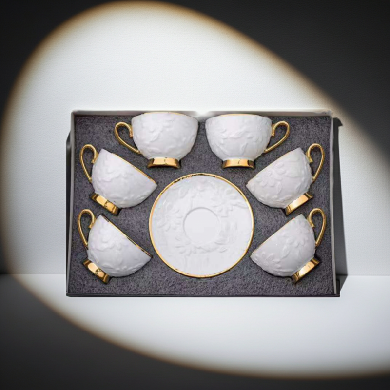 Всеки комплект включва 6 чаши с вместимост 220 мл и 6 чинийки, изработени от фин порцелан. Деликатният бял цвят е умело комбиниран с елегантни златни акценти, които придават на комплекта луксозен и стилен вид. Релефните флорални мотиви добавят допълнителна изтънченост и уникалност на всяка чаша и чинийка.