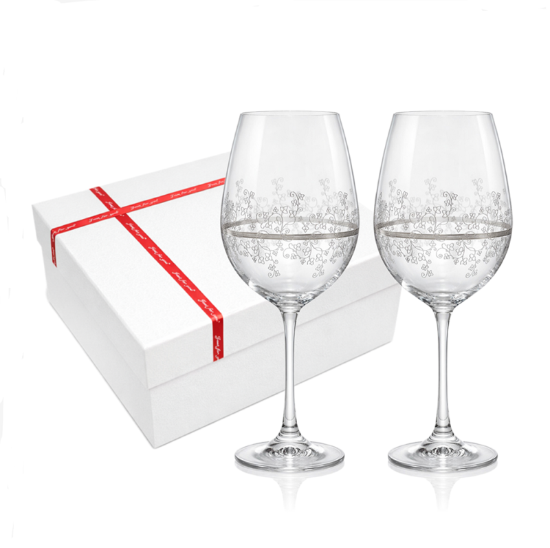 Харестеристика: Гладки стени, висок тънък крак, прозрачен цвят с нежна флорална гравюра и ръчно декориран платинен кант, подаръчна опаковка.