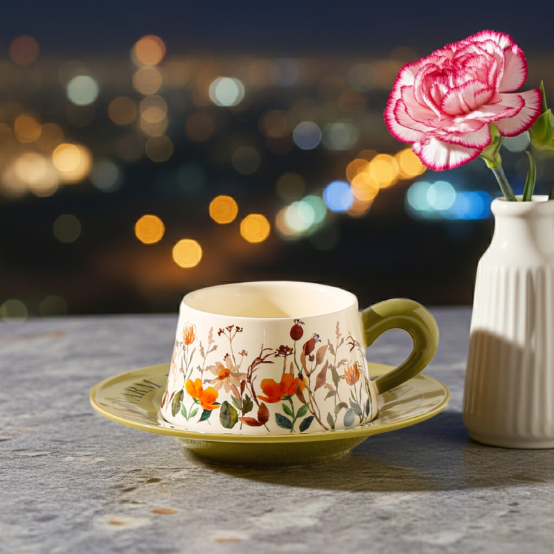 Внесете слънчево настроение във вашите сутрини с нашия очарователен порцеланов комплект за чай с декор цветя! Този изящен комплект включва чаша с вместимост 300 мл и елегантна чинийка, всички изработени от висококачествен порцелан и украсени с жизнерадостни мотиви на цветя.