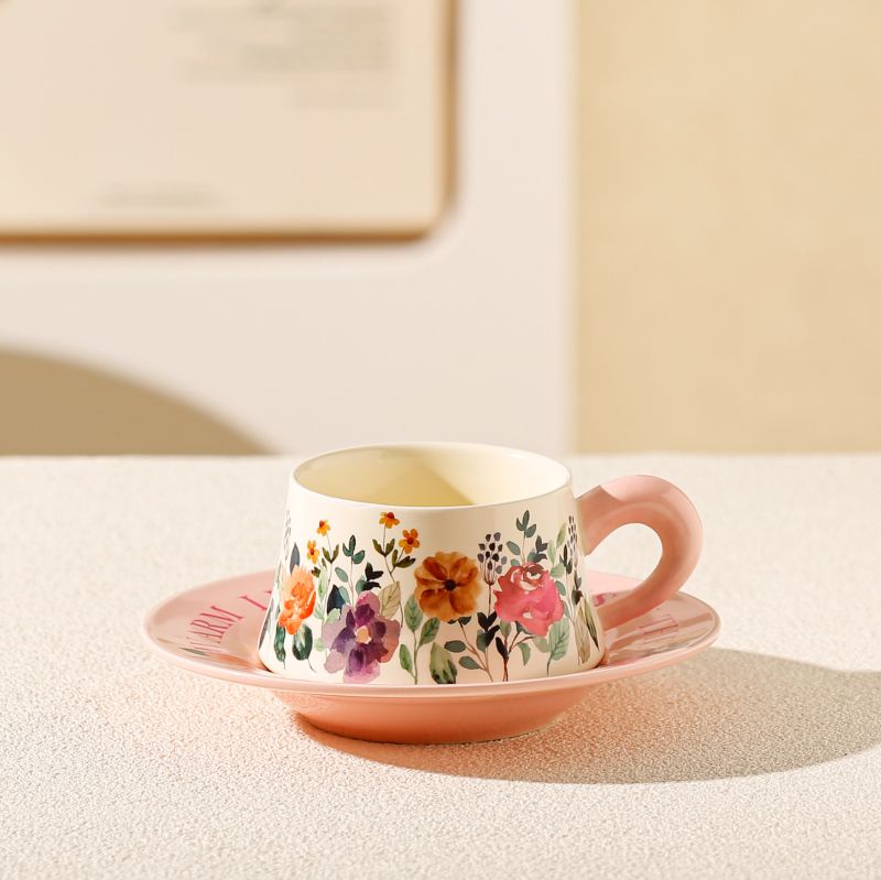 Чаша с чинийка Morello, розова с цветя - порцелан