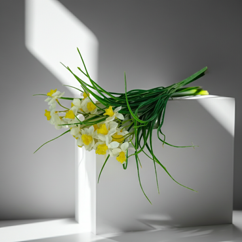 Този артистичен букет от нарциси е създаден, за да внесе свежест и жизненост във всяко пространство, без да изисква грижи или смяна на водата.