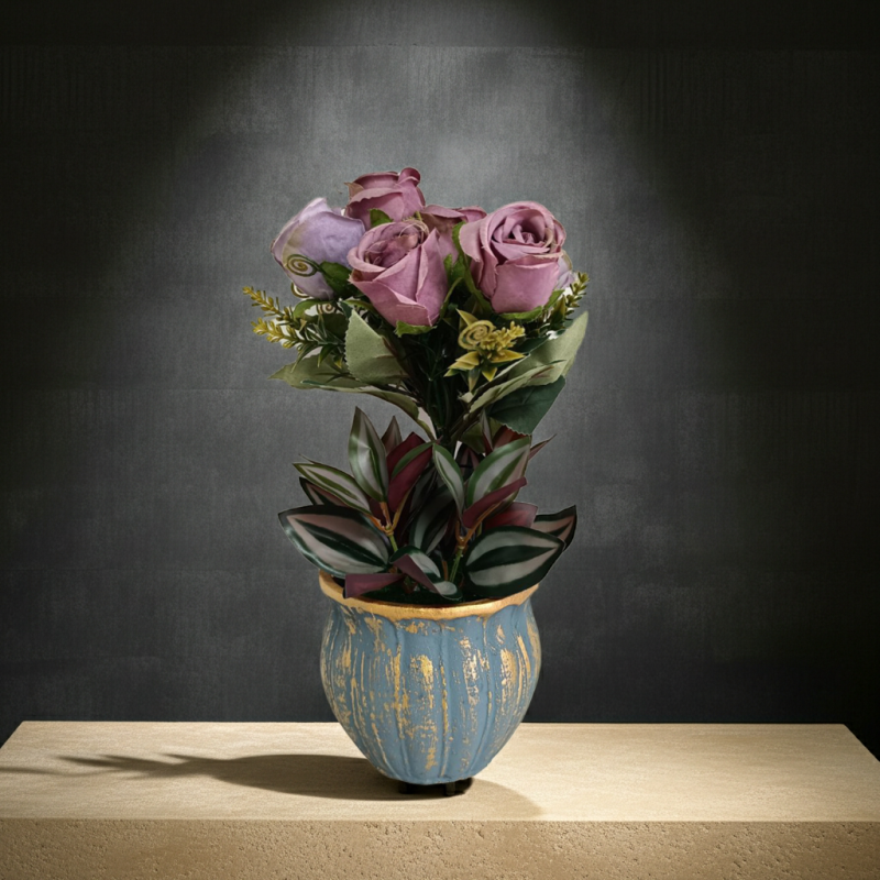 Лилавите цветя са подредени в хармоничен букет, който привлича погледа и създава усещане за свежест. Деликатните нюанси на лилавото добавят топлина и нежност към всяко пространство. Саксията е проектирана във винтидж стил, който се вписва лесно в различни интериорни решения - от класически до модерни.