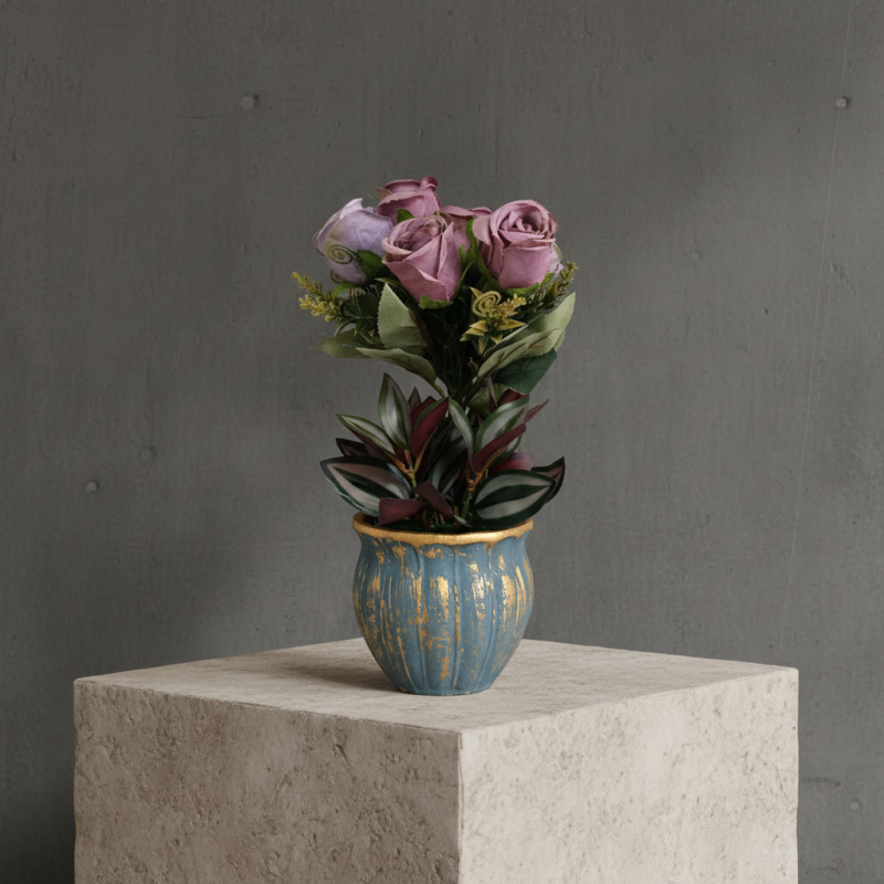 Винтидж саксия с букет лилави рози 70% коприна, 30% полиестер