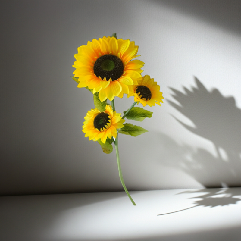 Внесете непреходната топлина на лятото в дома си с този впечатляващ декоративен слънчоглед от Morello. Проектиран с внимание към всеки детайл, стръкът съчетава три реалистични цвята в различна фаза на разцъфване, които придават обем и естествена динамика на всяка аранжировка.