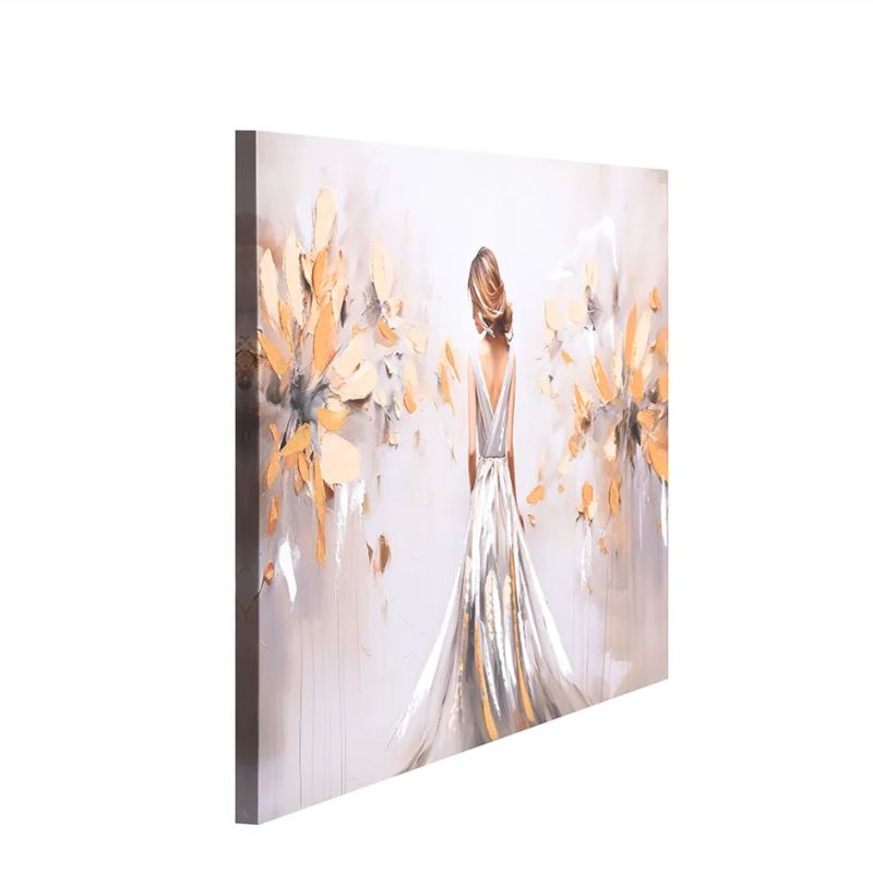 Добавете нотка на истинско изкуство в интериора си с паното „Златна елегантност“ от колекцията Morello. Тази картина не е просто репродукция – тя притежава авторски ръчно рисувани детайли, които улавят светлината и придават на изображението неповторим релеф. Всяка мазка върху златната рокля и абстрактните цветя е положена с внимание, за да създаде усещане за автентичност и висок стил.