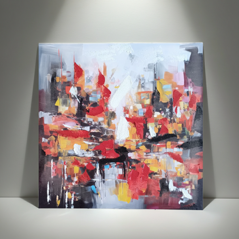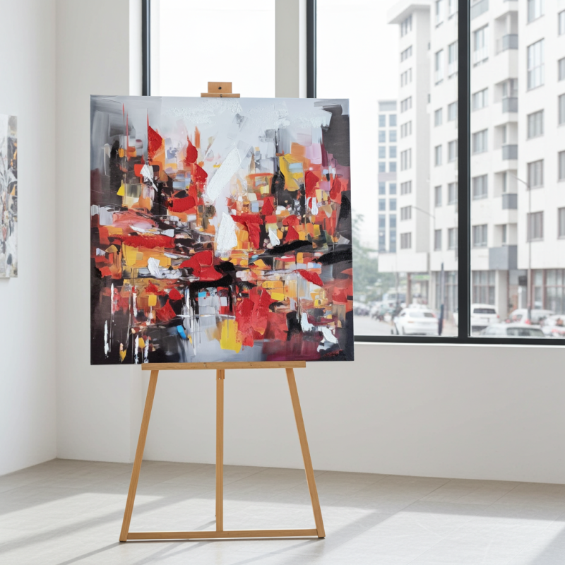 Експресивна абстракция: Динамична композиция в наситено червено, жълто и черно, носеща енергията на града.